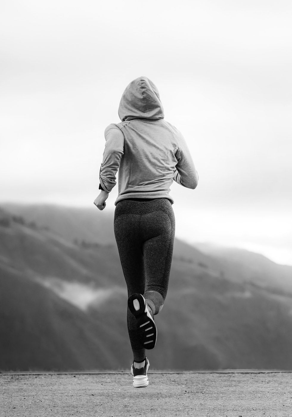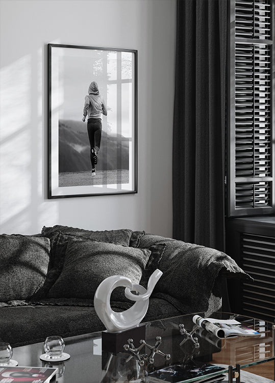 Een opvallende zwart-witfoto die de essentie van doorzettingsvermogen en vastberadenheid vastlegt. Dit kunstwerk, met een bewegende hardloper tegen een bergachtergrond, symboliseert kracht, uithoudingsvermogen en vastberadenheid. Een perfecte motivatieposter voor fitnessliefhebbers en mensen die een actieve levensstijl leiden.