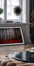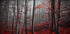 Een griezelig, surrealistisch bostafereel waarbij de grond bedekt is met dieprode bladeren die lijken op een bloedige rivier. De mistige sfeer en opvallende boomstammen contrasteren dramatisch met het intense rood, waardoor een donker maar aantrekkelijk, op de herfst geïnspireerd kunstwerk ontstaat. Perfect voor liefhebbers van surrealistische en sfeervolle kunst aan de muur.