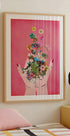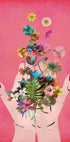 Een levendig en modern kunstwerk dat handen laat zien die een explosie van kleurrijke bloemen en bladeren loslaten tegen een roze achtergrond. De bloemencollage verenigt natuur en creativiteit en symboliseert groei, vernieuwing en schoonheid. Perfect voor moderne interieurs met een vleugje botanische charme.