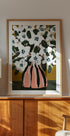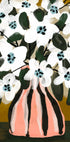 Een stoer en elegant bloemenstilleven met witte bloemen in een gestreepte roze vaas. Met vintage-geïnspireerde charme en pastelkleuren balanceert het kunstwerk een moderne grafische stijl met botanische zachtheid, perfect als decoratie in moderne en stijlvolle interieurs.