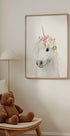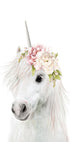 Een dromerige en sprookjesachtige illustratie van een eenhoorn versierd met zachte pastelkleurige bloemen. De witte achtergrond accentueert de magische en zachte sfeer van dit fantasierijke kunstwerk. Perfect voor kinderkamers, instellingen of voor iedereen die van mythische charme houdt.