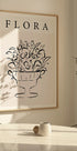 Een verfijnde minimalistische lijntekening van een vaas gevuld met bloemen, gepresenteerd in een elegante zwart-wit stijl. Het kunstwerk combineert eenvoud met verfijning en werkt als een tijdloze bloemenprint voor moderne en eigentijdse interieurs.
