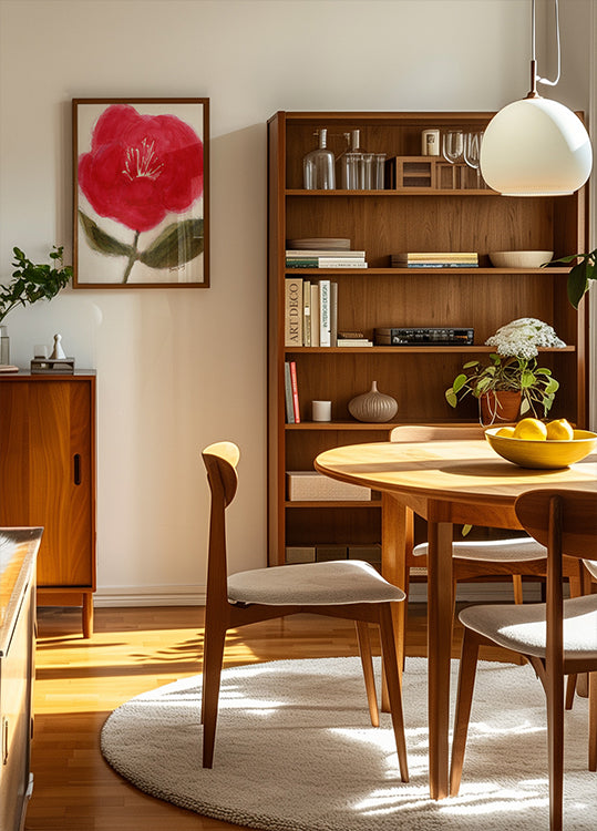 Floral In Red for Cierra van Janel Bragg springt in het oog met een sterke, elektrisch rode bloem, geschilderd in krachtige, organische lijnen. De witte oppervlakken en lichte tonen van groene bladeren creëren tegelijkertijd een zenachtige rust en moderne energie – een speelse, botanische abstractie die elke muur opfleurt. Perfect voor moderne kamers.
