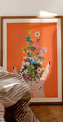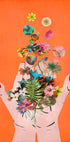 Een levendig en fantasierijk kunstwerk waarbij de handen kleurrijke bloemen en bladeren loslaten tegen een sterke oranje achtergrond. De digitale collage verenigt natuur en figuratieve kunst om een opvallende bloemenillustratie te creëren die vrijheid, creativiteit en schoonheid symboliseert.