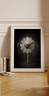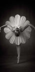 Een poëtische zwart-witfoto van een ballerina, waarbij de vorm van de tutu op een bloem lijkt. Het beeld, vastgelegd in een sierlijke pose op zijn tenen, verenigt elegantie, evenwicht en botanische symboliek in een dromerige combinatie van dans en natuur.