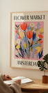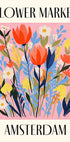 Een kleurrijke poster in retrostijl met opvallende tulpen en wilde bloemen op een levendige roze achtergrond. Geïnspireerd door de beroemde bloemenmarkten van Amsterdam, combineert dit kunstwerk reisnostalgie met botanische charme, perfect om elk interieur tot leven te brengen.