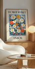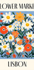 Een charmante retro poster met madeliefjes, klaprozen en wilde bloemen in warme oranje, witte en gele tinten op een blauwe achtergrond. Geïnspireerd door de levendige bloemenmarkten van Lissabon, legt dit kunstwerk Europese reisnostalgie en botanische schoonheid vast.