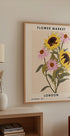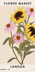 Een charmante bloemenposter met gouden zonnebloemen en zachtroze bloemen. Dit moderne, vintage-geïnspireerde kunstwerk viert de bloemenpracht van Londen en de levendige sfeer van de zomer.