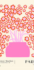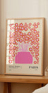 Een speelse bloemenposter met een opvallende roze vaas gevuld met gestileerde rode en roze bloemen. Dit moderne, grafische kunstwerk geeft een pop-art twist aan de Parijse bloemencharme.