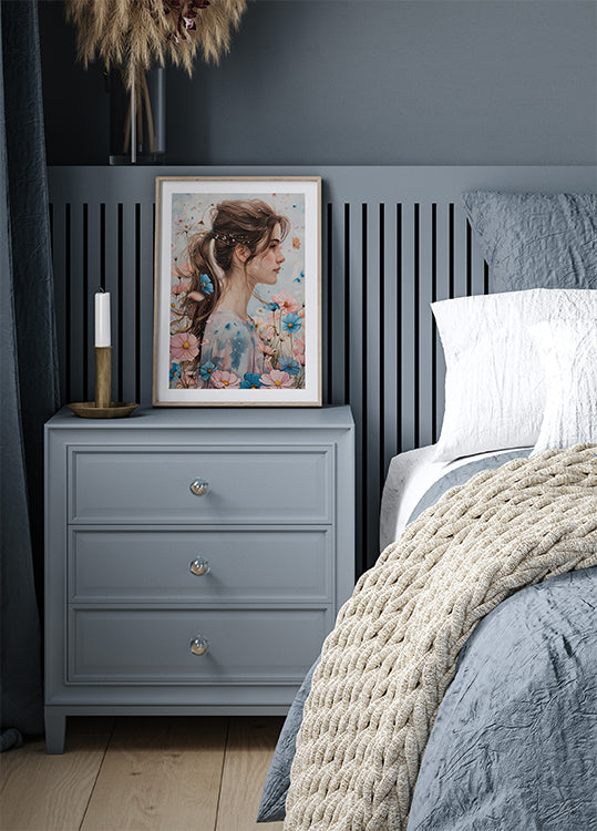 Een dromerig aquarel van een serene jonge vrouw omringd door bloeiende bloemen in pastelkleuren. De tere vlinders en zwevende blaadjes roepen een gevoel van rust en bezinning op, perfect voor het creëren van een harmonieuze en inspirerende sfeer.