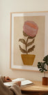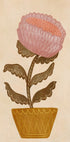 Een charmant aquarelkunstwerk met een delicate roze bloem in een gouden vaas. Met een vintage-textuurstijl en zachte pastelkleuren combineert dit handgeschilderde stuk retro-design met botanische elegantie, een tijdloze keuze voor bloemdecoratie.