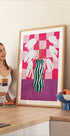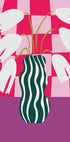 Een stoer en speels bloemenstilleven met een retro-modern tintje. De gestreepte vaas en abstracte witte bloemen staan tegen een levendige roze geruite achtergrond en zorgen voor een vrolijke mix van kleur, humor en grafisch ontwerp.