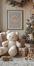 Midden in een winterlandschap staat een sprookjesachtig blauw peperkoekhuisje, versierd met suikerriet, sneeuwvlokken en bevroren details. Warm licht in de ramen nodigt uit tot gezelligheid, terwijl de heldere, rustige achtergrond de grafische eenvoud van het motief benadrukt. Een charmante kerstposter van Talitha McQueen. Perfect voor een kinderkamer, inkomhal of woonkamer klaar voor een gezellige kerstsfeer.