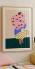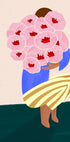 Een moderne abstracte illustratie van een vrouw die een groot boeket roze bloemen vasthoudt, geschilderd in krachtige en levendige kleuren. Met zijn minimalistische vormen, gestreepte broeken en moderne vormgeving past dit kunstwerk perfect in stijlvolle interieurs. Een speelse maar toch elegante wanddecoratie.