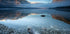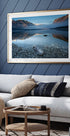 Een serene landschapsposter van het meer van Bohinj in Slovenië, waar stille wateren de bergen en mist weerspiegelen. De heldere kustlijn met stenen en een boomstam versterkt de kalme en harmonieuze sfeer, ideaal om vrede en rust te creëren in elke ruimte.