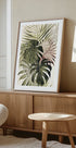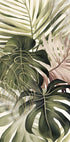 Een stijlvolle botanische compositie met weelderige tropische bladeren in zachtgroene tinten met vleugjes roze en gouden details. Het ontwerp combineert exotische palmbladeren en monstera voor een moderne boho-geïnspireerde look, perfect om frisheid en elegantie toe te voegen aan elk interieur.