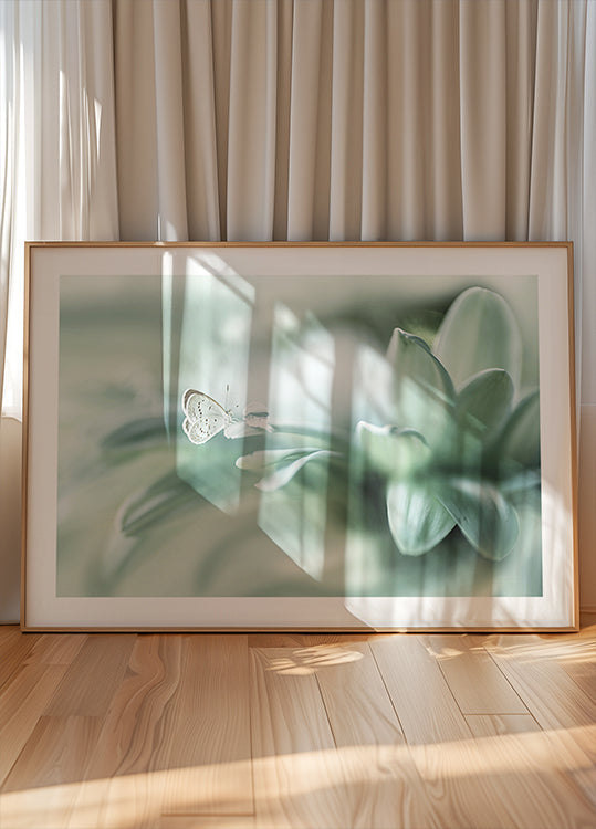 Een fijne macrofoto van een vlinder die zachtjes rust naast een sprankelende druppel water op zachtgroene bloemblaadjes. Met pastelkleuren en een dromerige onscherpe achtergrond legt dit kunstwerk de kwetsbaarheid, puurheid en de stille schoonheid van de natuur vast.