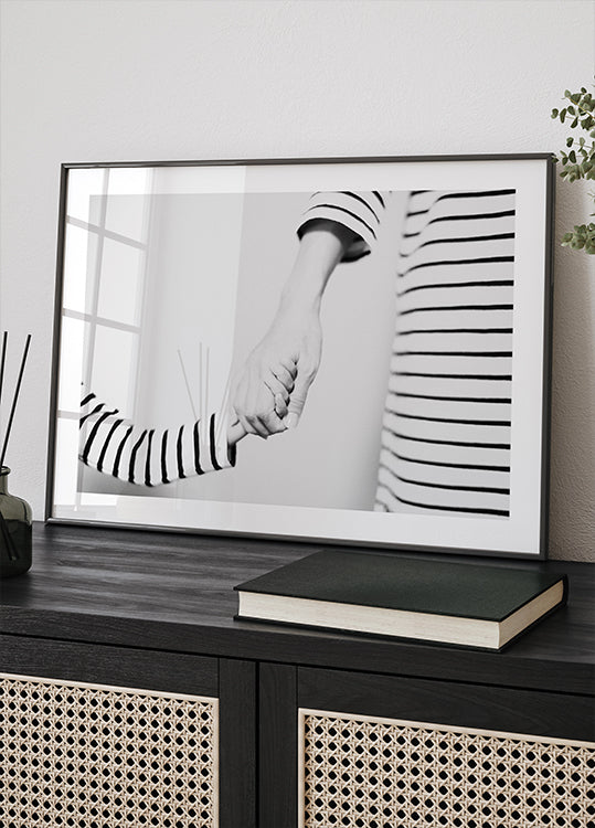 Deze ontroerende zwart-witposter legt de schoonheid van verbinding en vertrouwen vast. Een teder moment tussen twee handen, omlijst door gestreepte kleding, symboliseert liefde, familie en gemeenschap. Minimalistisch en toch diep emotioneel, een tijdloos stuk dat perfect past in moderne en klassieke woningen.