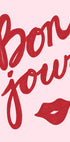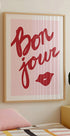 Een speelse en stijlvolle typografieposter met het Franse woord Bonjour en een illustratie van rode lippen op een zachtroze achtergrond. Perfect voor moderne interieurs en geeft een vrouwelijke en elegante sfeer aan de wanddecoratie.