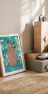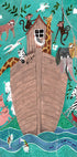 Een speelse en kleurrijke illustratie van de ark van Noach gevuld met dieren zoals giraffen, olifanten, zebra's, apen en vogels. Omringd door weelderige bloemen en levendig water, vangt dit charmante kunstwerk de vreugde en verbeeldingskracht van het geliefde Bijbelverhaal. Perfect voor kinderkamers, kinderkamers of voor iedereen die van dierenillustraties houdt.