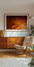 Een vlammend abstract kunstwerk dat tinten rood, oranje en goud combineert en zowel de stroming van water als de intensiteit van vuur oproept. Met schilderachtige wervelingen en zachte texturen straalt het stuk warmte, passie en energie uit, perfect voor gedurfde interieurs of als dramatisch middelpunt.