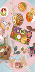 Een levendige illustratie die de vreugde van een brunch met vrienden rond een kleurrijke tafel weergeeft. Van ramen en taco's tot croissants en vers fruit: dit kunstwerk viert de mondiale keuken en gemeenschap, waarbij voedsel wordt benadrukt als voeding en als gedeelde ervaring van liefde en vriendschap.