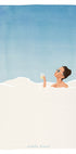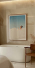 Een stijlvolle illustratie van een vrouw die geniet van een bubbelbad onder een helderblauwe hemel, met een glas wijn in de hand. Het minimalistische design en de zachte pastelkleuren creëren een rustige en luxueuze sfeer, perfect voor ontspanningsruimtes of als elegante decoratie.