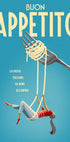 Een kleurrijke en speelse poster in Italiaanse stijl met een illustratie van een vrouw die slingert aan pastadraden die om een vork zijn gewikkeld. Met de opvallende tekst Buon Appetito het viert de vreugde van Italiaans eten en het gevoelvolle comfort, een mix van humor en stijl in een opvallend kunstwerk.