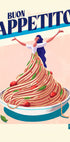 Een vrolijke en speelse Italiaans geïnspireerde poster met de opvallende zin Buon Appetito. Het toont een vrouw wiens jurk van een berg spaghetti met tomaten en basilicum naar beneden stroomt, een humoristische mix van eetcultuur en illustratie in een levendig kunstwerk.
