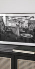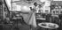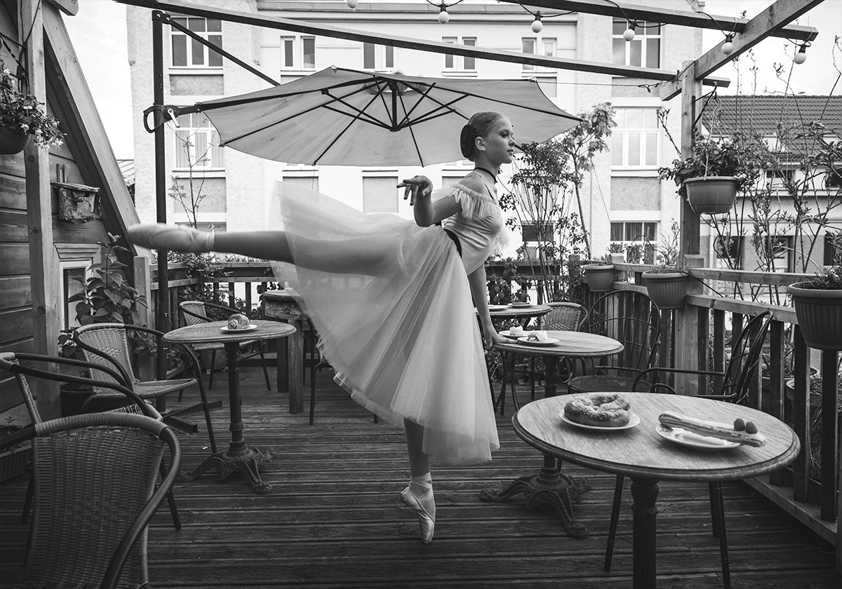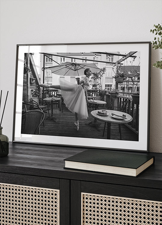 Een sierlijke ballerina poseert op een caféterras op deze elegante zwart-witfoto. Een combinatie van dans, architectuur en stadsleven in een café zorgt voor een poëtisch en tijdloos kunstwerk.