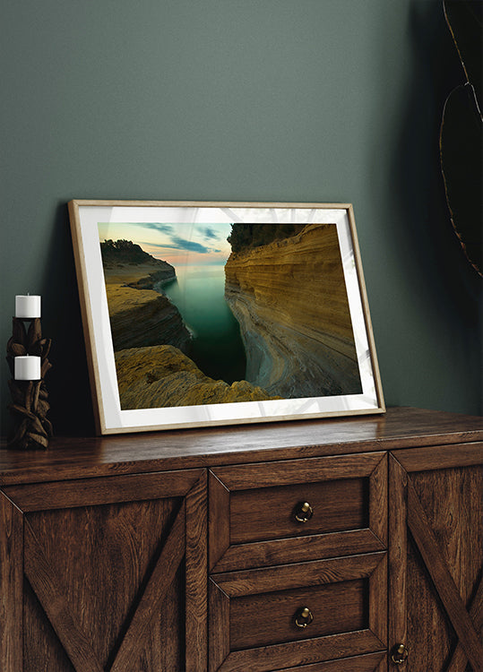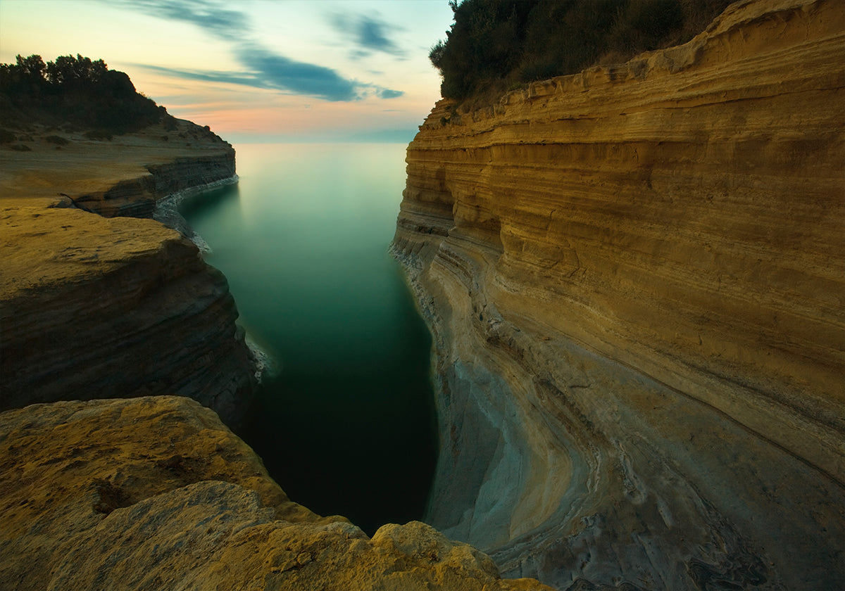 Een serene opname met lange belichtingstijd van het iconische Canal d'Amour in Corfu, Griekenland. De smaragdgroene wateren worden omlijst door dramatische zandstenen kliffen, waardoor een mysterieuze en romantische sfeer ontstaat. Dit kustlandschap weerspiegelt de natuurlijke schoonheid, tijdloze rust en legendarische charme van de Ionische Zee.