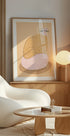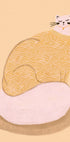 Een grillige illustratie van een witte kat die een botergele trui met patroon en golfachtige patronen draagt. De moderne en gezellige stijl, gecombineerd met een zacht pastelpalet, maakt hem perfect voor eclectische interieurs, kinderkamers of als leuk kunstwerk voor kattenliefhebbers.