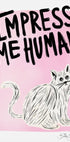 Een humoristische en speelse kattenposter met de duidelijke tekst "Impress Me Human" en een grappige schets van een donzige kat op een roze achtergrond. Perfecte muurkunst voor kattenbezitters en kattenliefhebbers die van humor, illustratie en typografie houden.