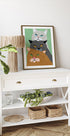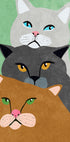 Een gewaagde en moderne illustratie van drie gestileerde katten op elkaar gestapeld in een speels portret. Met expressieve snorharen, levendige ogen en een kleurrijk grafisch ontwerp is dit kunstwerk perfect voor kattenliefhebbers en voegt het een eigenzinnige, moderne sfeer toe aan elke kamer.