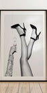 Een stijlvolle zwart-wit modefoto die hoge hakken, champagne en speelse elegantie vastlegt. Het minimalistische contrast creëert een gedurfde feestsfeer, perfect voor moderne interieurs en mode-geïnspireerde kunst aan de muur.