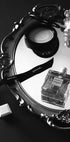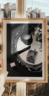 Een stijlvolle zwart-witfoto van Chanel-schoonheidsproducten, met het iconische Gabrielle Chanel-parfum, een elegant lint en verfijnde details op een vintage spiegel. Deze print drukt tijdloze Franse luxe en verfijning uit en wordt een elegant statement in interieurs geïnspireerd door mode, schoonheid en klassieke elegantie.