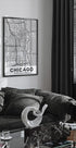 Een stijlvol, monochroom eerbetoon aan Chicago: letters en grafische elementen komen samen in een rustig, evenwichtig motief dat het karakter van de stad in zwart-wit benadrukt. Minimalistisch en retro tegelijk, perfect om de woning een urban touch te geven. Ontwerp door StudioSix. Past mooi in de hal, woonkamer of kantoor en past bij zowel moderne als vintage interieurs.