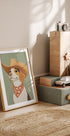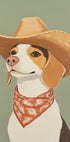 Een speels en charmant kunstwerk van een beaglehond verkleed als cowboy, met een brede hoed en bandana met patroon. Dit humoristische dierenportret combineert een rustieke westerse stijl met lichte humor – perfect voor hondenliefhebbers en grillige kunstcollecties aan de muur.