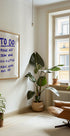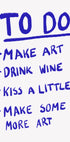 Een speels en motiverend typografisch stuk met een handgeschreven "To Do"-lijst: Maak kunst, drink wijn, kus een beetje, maak nog meer kunst. Met opvallende blauwe tekst op een witte achtergrond combineert deze leuke en moderne poster humor, romantiek en creativiteit – perfect voor koppels, kunstenaars of iedereen die graag met passie leeft.