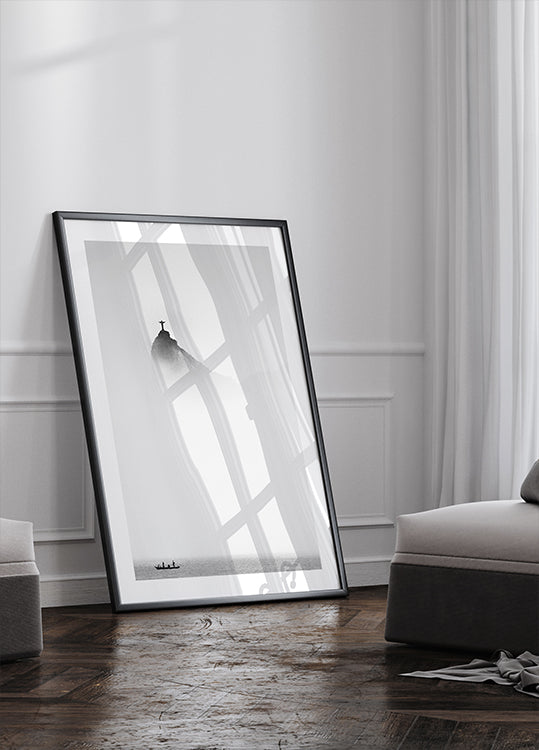 Een serene zwart-witfoto van het iconische standbeeld van Christus de Verlosser in Rio de Janeiro, majestueus boven de mist. De wazige sfeer zorgt voor een spirituele en contemplatieve sfeer, terwijl een roeibootje op het water de schaal en diepte van het tafereel benadrukt. Een tijdloos werk dat monumentaliteit combineert met sereniteit, perfect voor liefhebbers van religieuze, architecturale en minimalistische fotografie.