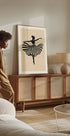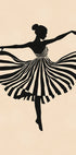 Een sierlijk zwart silhouet van een ballerina in het midden van een pirouette, waarbij de gestreepte jurk elegant beweegt. De zachtbeige achtergrond en het sterke contrast geven dit stuk een tijdloze, stijlvolle uitstraling — perfect voor het toevoegen van artistieke beweging aan de woonkamer, studio of galerijmuur.