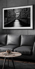 Een dramatische, monochrome reis door de Hamburgse grachtengordel: bakstenen gevels en een lage brug trekken de aandacht naar de horizon, terwijl stilstaand water licht en schaduw reflecteert. Stefan Eisele vangt de koele rust van de stad met strakke lijnen, symmetrie en diepte – een stedelijk motief dat uitnodigt tot contemplatie. Het motief is een eerbetoon aan de tijdloze geometrie van Speicherstadt.