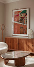 De La Villa af Claudia Casal fanger en stemningsfuld gade i Madrid, hvor farverige tørklæder og tekstiler svæver over en livlig markedsplads. Varme terrakottatoner, bohemeenergi og subtile urbane detaljer leder tankerne mod spansk kultur og rejselyst — et blikfang til hjemmet. Perfekt til dem, der elsker autentiske gadeøjeblikke og varme farver.