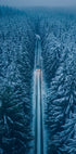 Een eenzame winterweg snijdt door een donker dennenbos, gehuld in mist en blauwachtige gloed. Ver voor zich doorbreken autokoplampen de stilte en leiden het oog naar de horizon, waar sneeuw en mist elkaar ontmoeten. De strakke symmetrie en de melancholische rust vangen het verlangen van de reis op. Foto door Oskar Ulvur. Perfect voor wie van rustige winterlandschappen houdt.