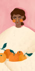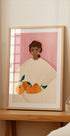 Dit kunstwerk toont een gestileerd portret van een persoon die sinaasappels vasthoudt tegen een pastelroze achtergrond. De warme tinten en het moderne design benadrukken thema's als natuur en eenvoud en verenigen esthetiek uit zowel hedendaagse kunst als illustratie.