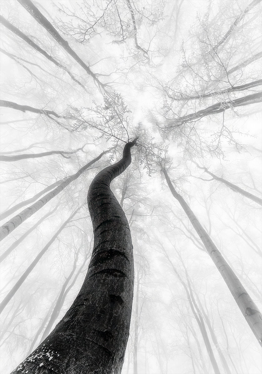 Een rustig wintermoment vastgelegd door fotograaf Tom Pavlasek: slanke beuken staan in de sneeuw, gehuld in mist en vorst. De zachte grijs- en wittinten creëren diepte en rust, terwijl de herhaalde spanningen grafische lijnen in het landschap trekken. Een minimalistische, Scandinavische sfeer voor in huis. Perfect voor ruimtes die op zoek zijn naar helderheid, stilte en natuur.