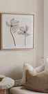 Een poëtische studie van dezelfde tulp, van voren en van achteren gezien: twee monochrome close-ups, waarbij licht en schaduw de delicate structuur en elegante rondingen van de bloemblaadjes benadrukken. De compositie is minimalistisch en evenwichtig, een rustig botanisch verhaal gecreëerd door fotograaf Lotte Grønkjær. Een grafische, heldere uitdrukking die de kamer tijdloze rust geeft.