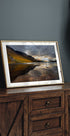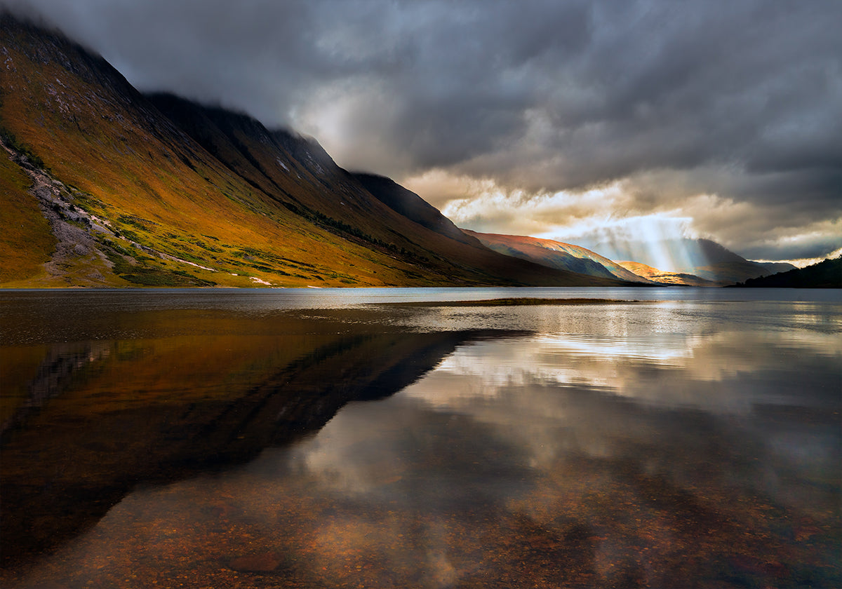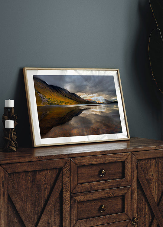 Een prachtige landschapsposter uit Glencoe, Schotland, waar dramatische wolken opengaan en zonnestralen over de hooglanden en het meer vallen. Het kalme water weerspiegelt de ruige bergen en creëert een krachtige maar vredige compositie die de harmonie en stilte van de natuur vastlegt.