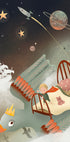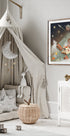 Een magische en grillige illustratie van een kind dat door het universum vliegt op een bed dat is omgevormd tot een vogel met een kroon. Omringd door sterren, planeten, raketten en droomschepen aan de nachtelijke hemel, spreekt het werk tot de verbeelding en dromen uit de kindertijd.