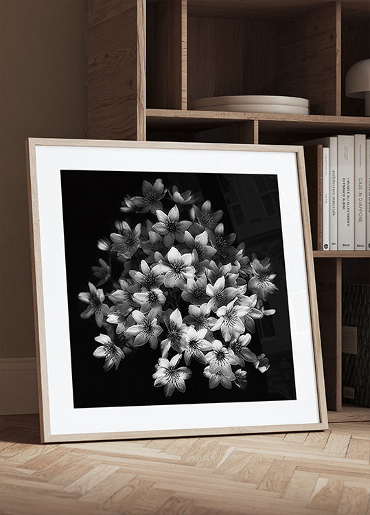 Early Sensation van Yvette Depaepe is een poëtisch, zwart-wit portret van bloeiende clematis. Tegen een diepe, fluweelzachte donkere achtergrond komen lichtgevende bloemblaadjes tevoorschijn met sculpturale rondingen en fijne nerven, die het rustige drama van de bloemen onthullen. Een verfijnd botanisch stilleven met rust, contrast en tijdloze elegantie. Gemaakt in Brugge, België.
